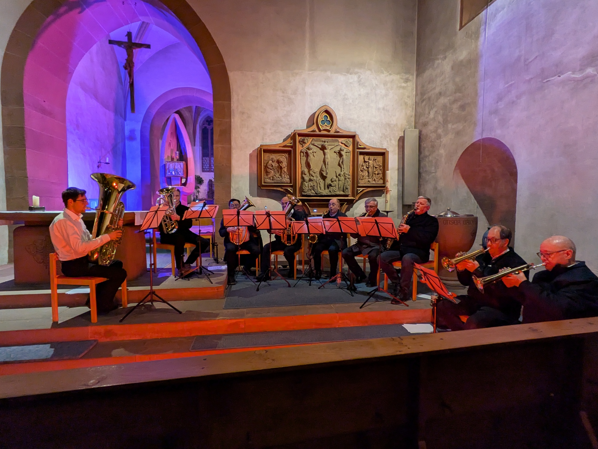 Die „Trettstein – Combo“ aus Gräfendorf und Umgebung hatte die Gestaltung der „Abendgesänge“ im pastoralen Raum Gemünden übernommen. Das Bläserensemble unter der Leitung von Wolfgang Schelbert (Gräfendorf) gibt es seit 2006, also genauso lange wie die „Abendgesänge“ selbst. Zum Thema „Dreiklang der Tugenden: Glaube – Hoffnung – Liebe“ spielten die neun Bläser Lieder aus dem Gotteslob und andere zum Motto passende Songs zum Zuhören und Mitsingen. Martina und Wolfgang Schelbert und Claudia Simon sprachen die von Wolfgang Schelbert zusammengestellten Texte zu den Songs - mal informativ, mal meditativ. Pastoralreferent i.R. Klaus Simon sorgte mit Claudia Simon für die farbige Illumination der Kirche und lobte am Ende der „Abendgesänge“ den Klang und die Rhythmik der Gruppe und bedankte sich herzlich für die 20 – jährige treue und verlässliche Mitarbeit bei den „Abendgesängen“. Reichlich Beifall sorgte für eine Zugabe am Ende des sonntäglichen Abendausklangs in der Stadtpfarrkirche St. Peter und Paul in Gemünden.
