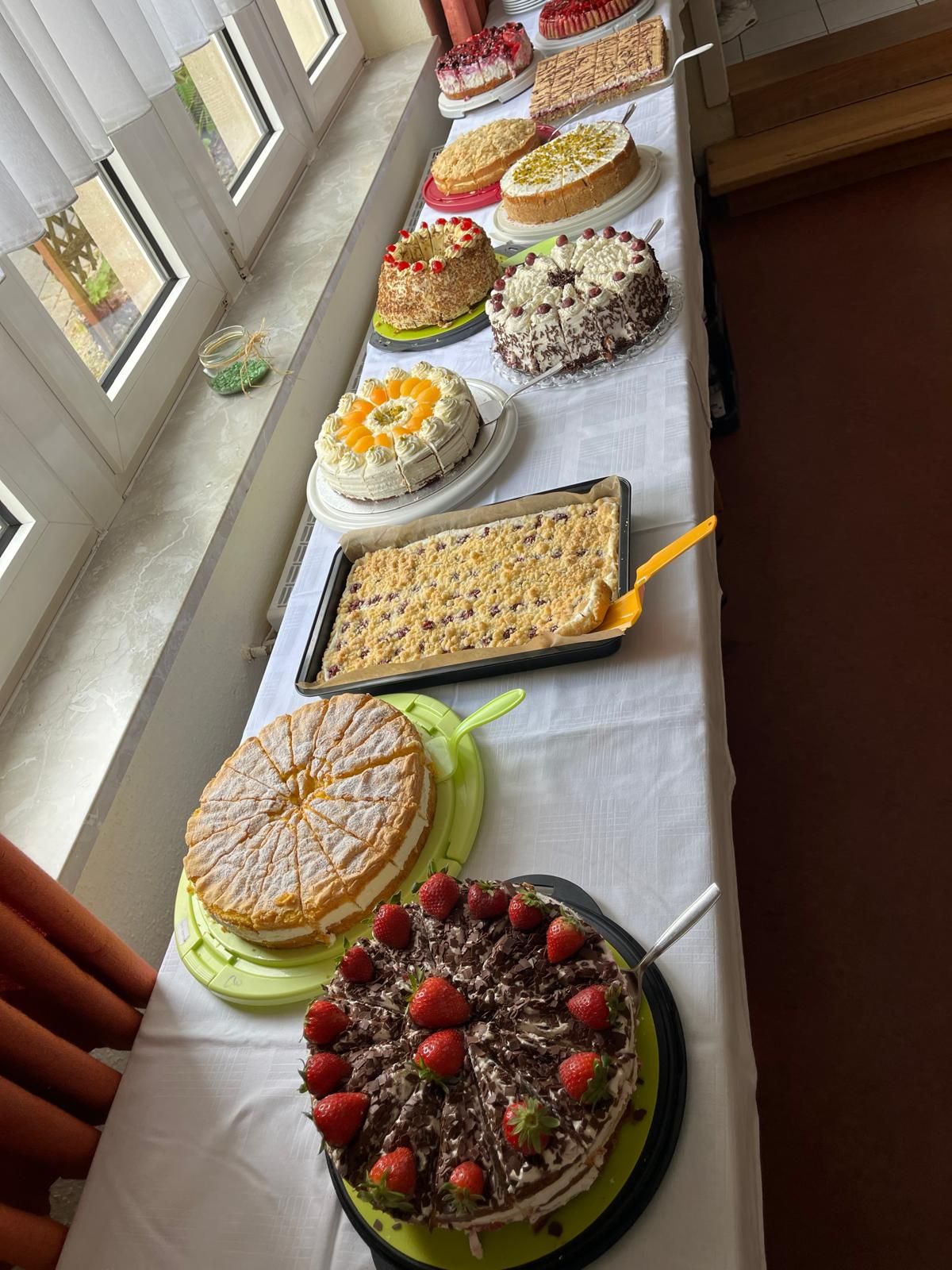 Nach dem Gottesdienst am Zielort Rengersbrunn, wartete auf die Gruppe ein kulinarischer Höhepunkt: ein liebevoll vorbereitetes Kuchenbuffet. Die Auswahl an selbstgebackenen Torten sorgte für leuchtende Augen und diente nicht nur der Stärkung nach den anstrengenden Etappen, sondern auch als Symbol für ein herzliches Willkommen.