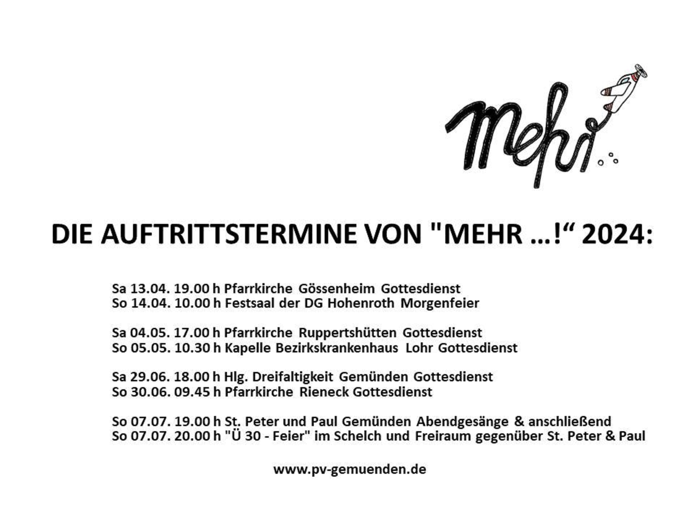 Die nächsten Termine von "Mehr...!" finden sich unter www.pv-gemuenden.de und dort unter dem Button "Mehr".