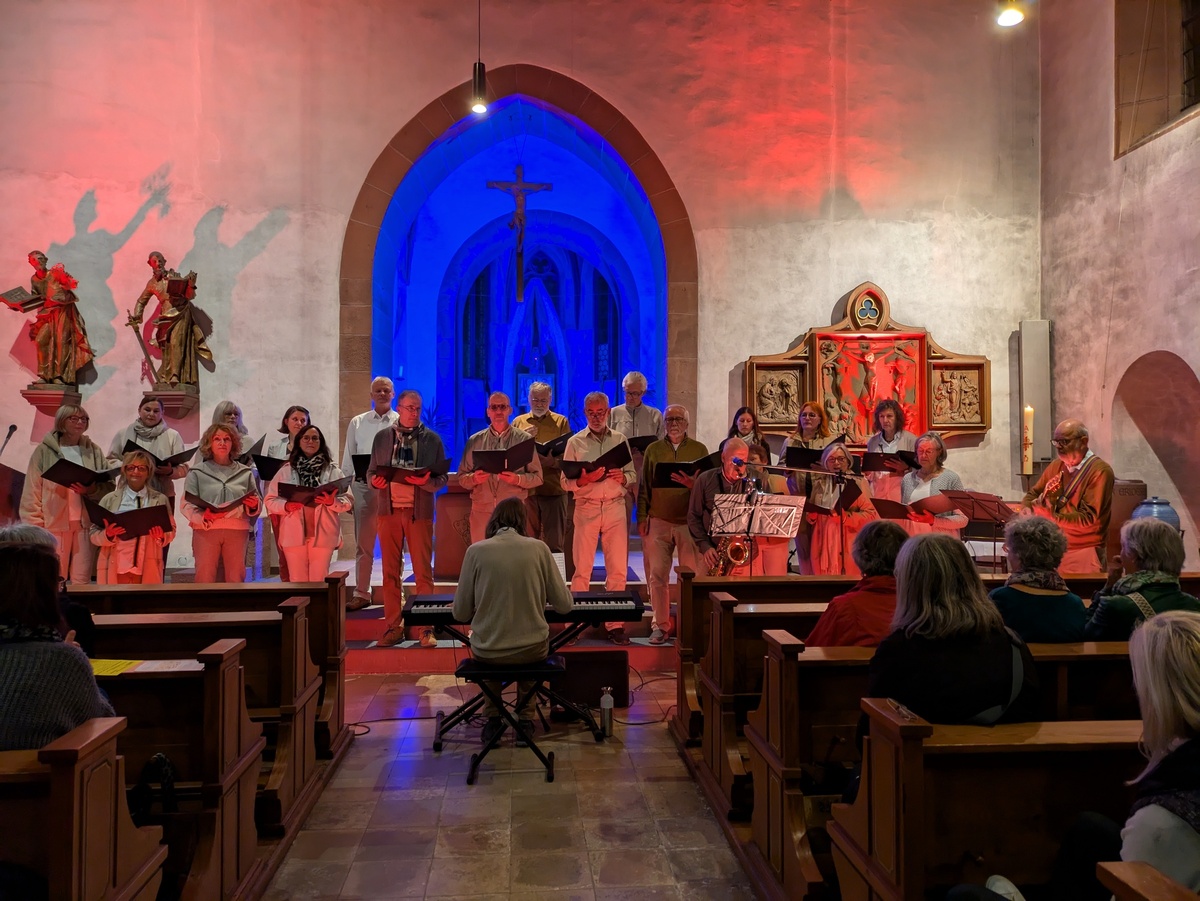 Über 20 Sängerinnen und Sänger, instrumental unterstützt mit Saxophon (Friedbert Heckmann), Querflöte (Corina Ammersbach), Gitarre (Valentin Fell) und Klavier (Stefan Ammersbach), sangen sich unter der Leitung von Stefan Ammersbach und der Moderation von Maria Heckmann sehr schnell und mühelos in die Herzen der zahlreichen Zuhörerinnen und Zuhörer in der Gemündener Stadtpfarrkirche St. Peter und Paul. Diese wurde von Clemens Atzmüller ansprechend und farbig illuminiert.