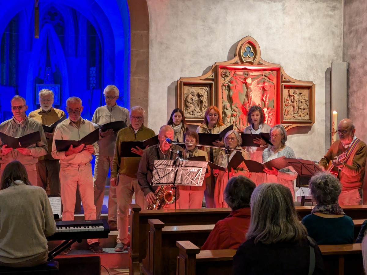 Songs zum Thema Hoffnung, gemeinsame Lieder mit dem Publikum, teilweise acapella, teilweise mit Instrumentalbegleitung wechselten sich ab und gaben der spirituellen Stunde ein weites Klangspektrum mit anspruchsvollem und spannendem Chorsound. Dabei wurde mit den Liedtiteln und in der Moderation nichts schön gefärbt, sondern die Wirklichkeit von Krieg, Tod und Krankheit, Einsamkeit und Klimawandel angesprochen und mit der Bitte um Frieden, Gesundung, Gemeinschaft und Einsatz für die Schöpfung ins Gebet genommen. Ermutigung durch die Botschaft der Songs stand im Vordergrund: Hoffnung bewahren, gemeinsam an der Lösung der Probleme arbeiten und füreinander da sein im Vertrauen auf Gott und sein Licht.