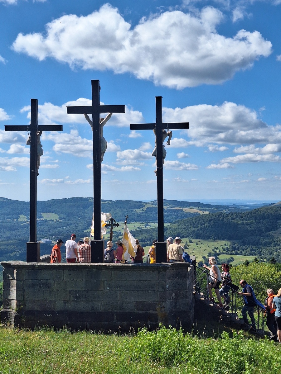 In diesem Jahr beginnt die Wallfahrt von Gräfendorf zum Kreuzberg am Tag nach Fronleichnam in den Pfingstferien. Die Wallfahrt findet vom 05. Juni bis 07. Juni 2026 statt. Gerne können sich auch Wallfahrtsteilnehmer tageweise oder nur streckenweise der Pilgerschar anschließen, z.B. von der Heckmühle nach Schondra oder von Schondra zum Kreuzberg oder vom Guckaspass zum Kreuzberg. Außerdem bieten wir eine Enkel-Großelternwallfahrt an, bei der Großeltern mit ihren Enkelkindern oder Kommunionkinder oder Ministranden am Samstag, den 06.06. um 13:30 Uhr mit einem Kleinbus in Gräfendorf abgeholt werden, zum Guckaspass in der Rhön gefahren und von dort mit der großen Wallfahrergruppe die 5,5 Kilometer über das Gipfelkreuz des Kreuzberges zum Kloster Kreuzberg wandern. Nach der Einkehr in der Klosterschänke können die Großeltern mit ihren Enkeln oder mehrere Kinder in einem Zimmer im Kloster übernachten oder nach Gräfendorf zurückgefahren werden.