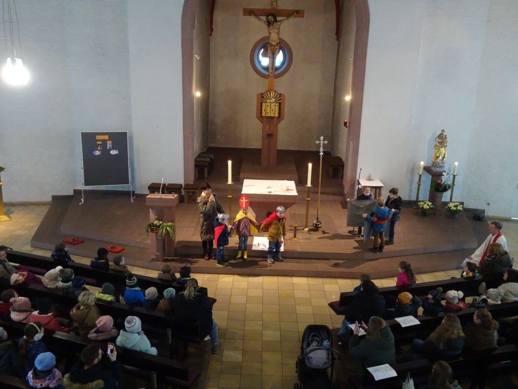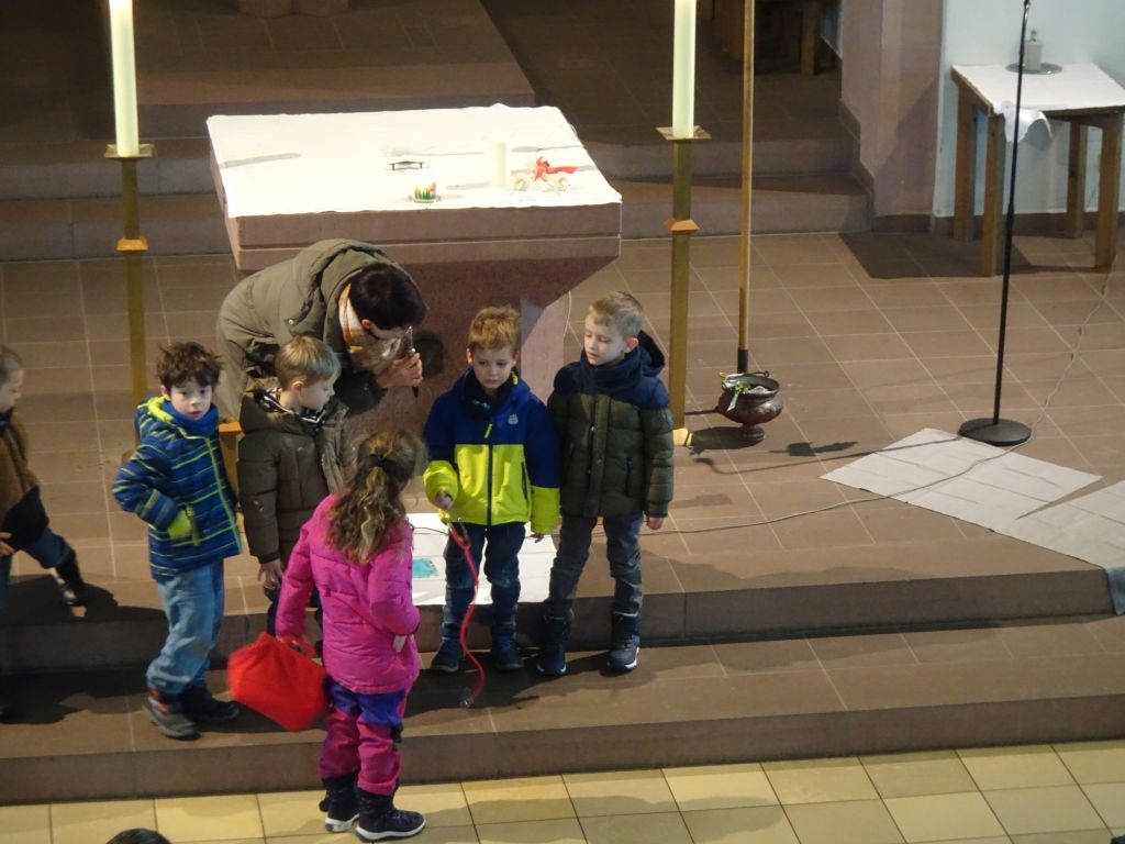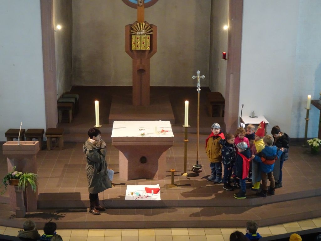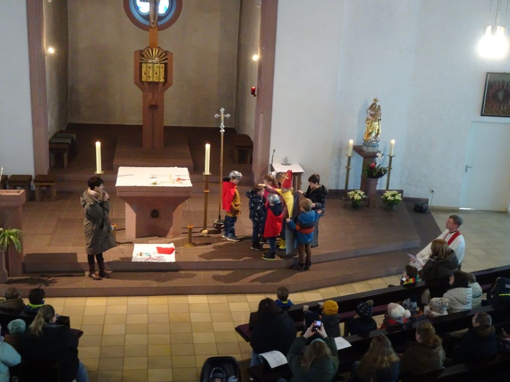 Mit verschiedenen Krankheiten haben die Kinder auch schon ihre Erfahrungen gemacht und was da helfen kann, haben sie mitgebracht: einen Verband und Pflaster, Hustensaft und Kühlakku und eine Creme. Manchmal müssen sie auch einen Arzt aufsuchen, damit sie wieder gesund werden. Heute geht es um einen besonderen Mann, der die Menschen geheilt und ihnen geholfen hat, den Hl. Blasius. Er war nicht nur Arzt, sondern auch Bischof. Was Blasius so alles getan und erlebt hat, wurde von den Vorschulkindern lebendig dargestellt und nachgespielt.
