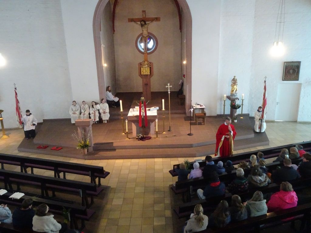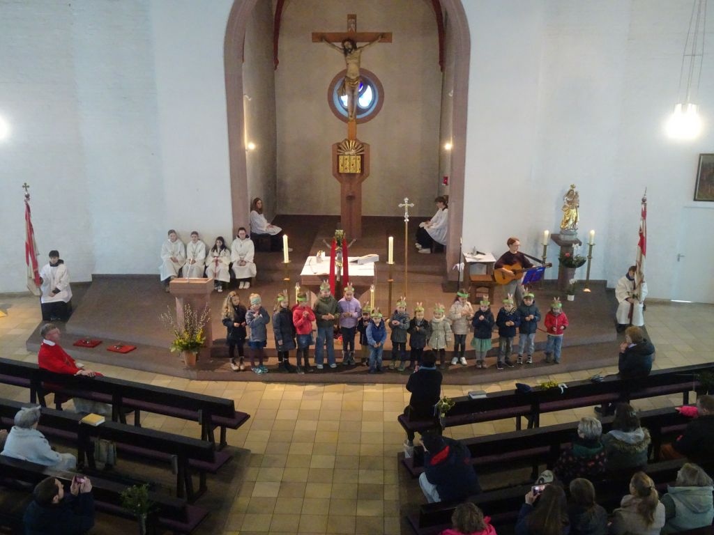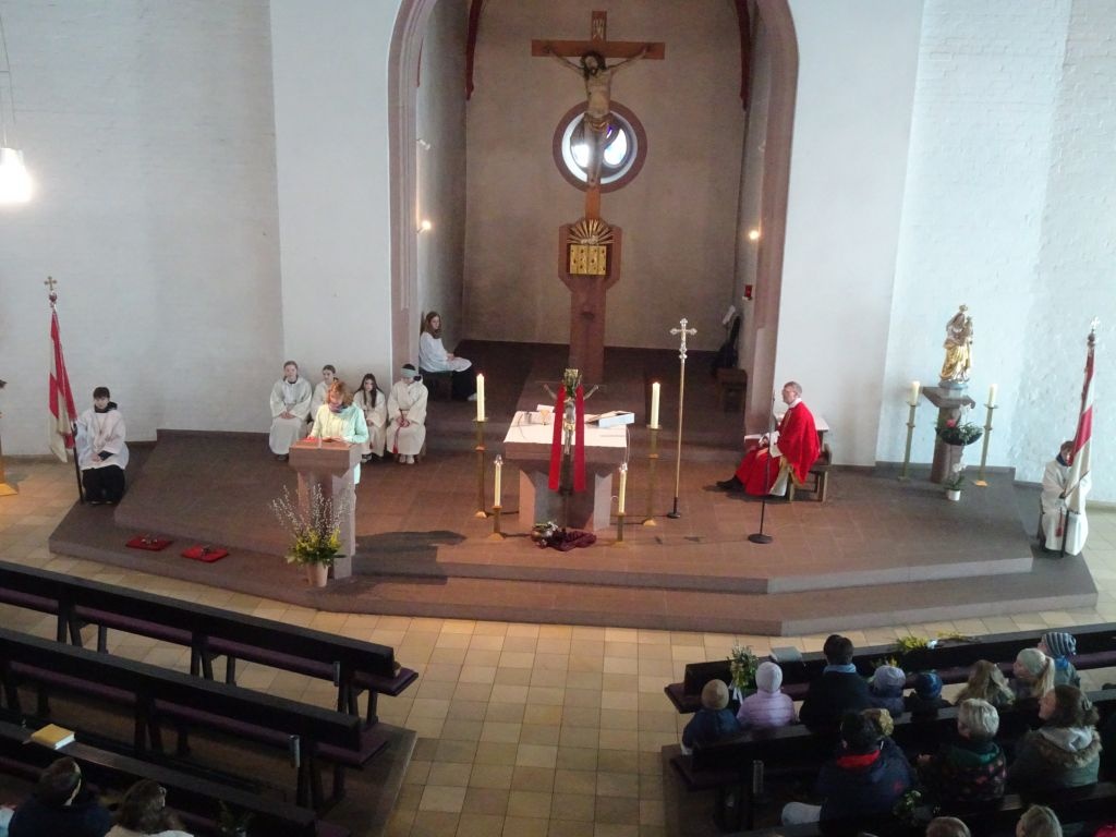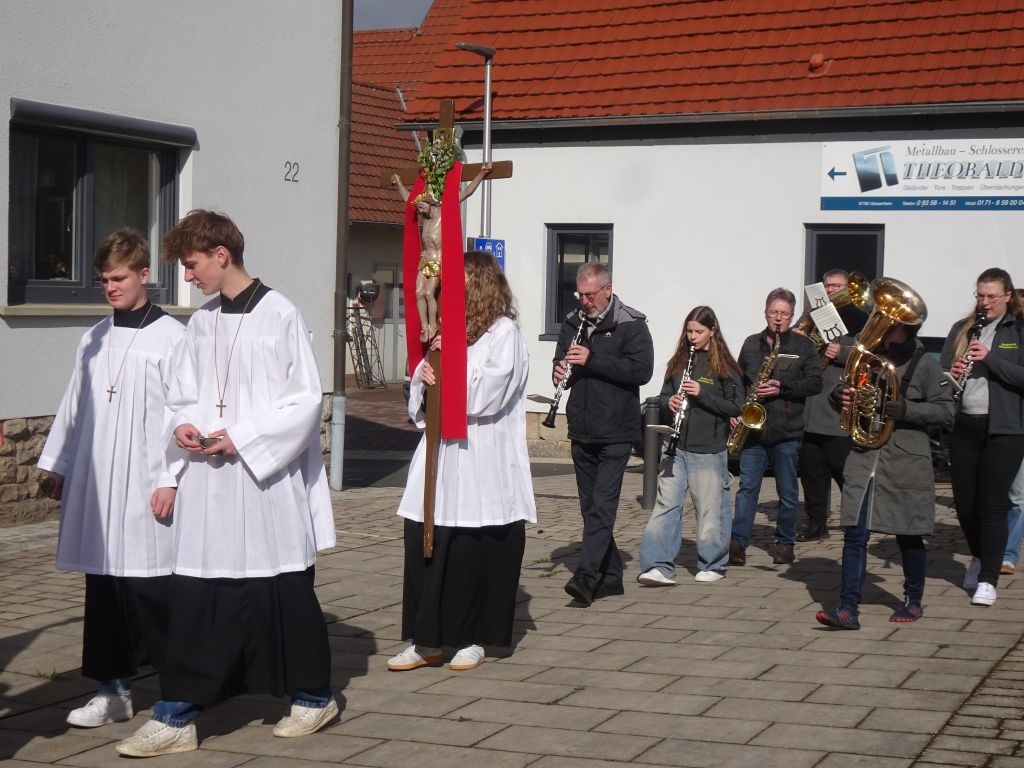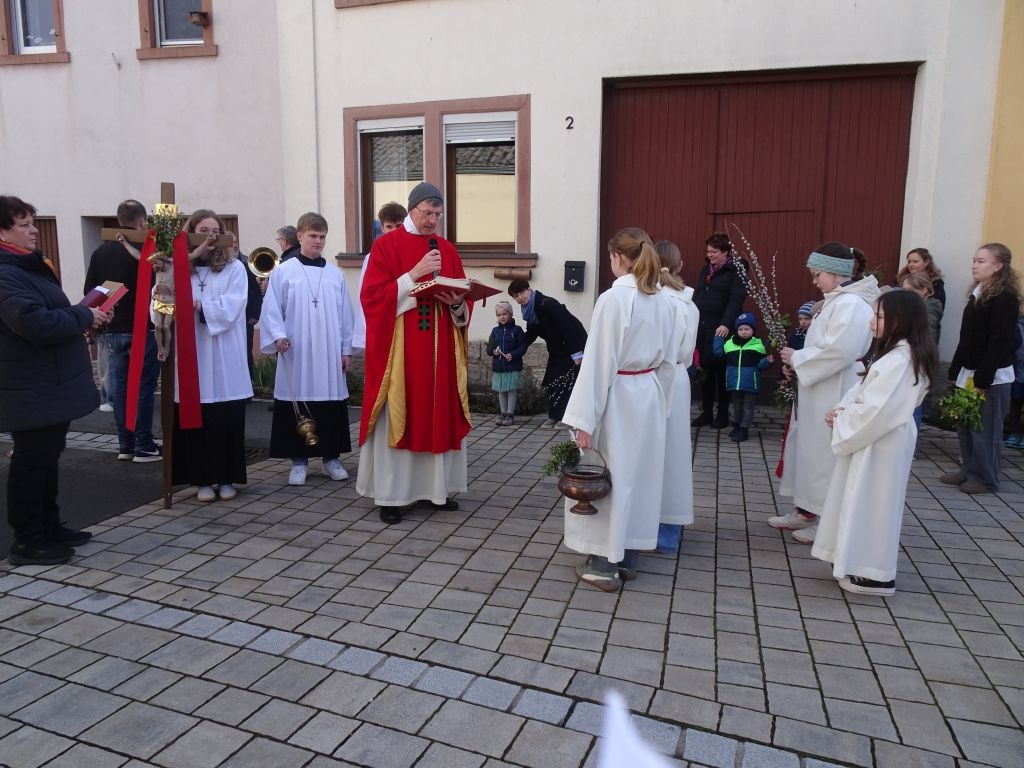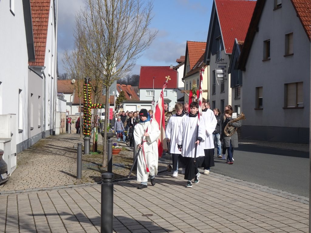 „Hosanna“ – erschallte es am Palmsonntag. Bei einer kleinen Prozession ertönte der Jubelruf und die Palmbuschen wurde kräftig geschwenkt, sehr zur Freude der teilnehmenden Kinder. Zu den Klängen der Musikkapelle zogen die Gläubigen in die Kirche ein und feierten mit Pfr. Thoma und den Ministranten einen Festgottesdienst. Nach der Messe wurden wir von den Kindergartenkindern mit Osterliedern auf das Fest eingestimmt und der Elternbeirat verkaufte leckeres Ostergebäck.