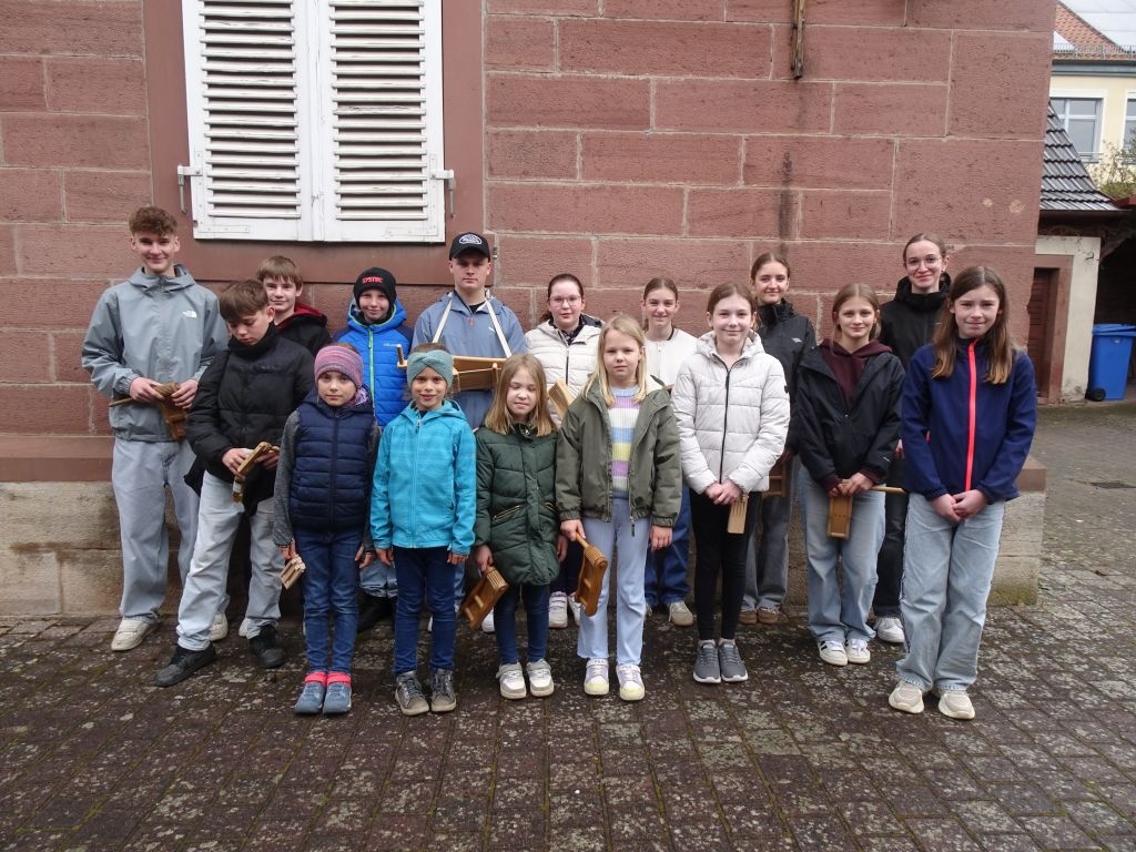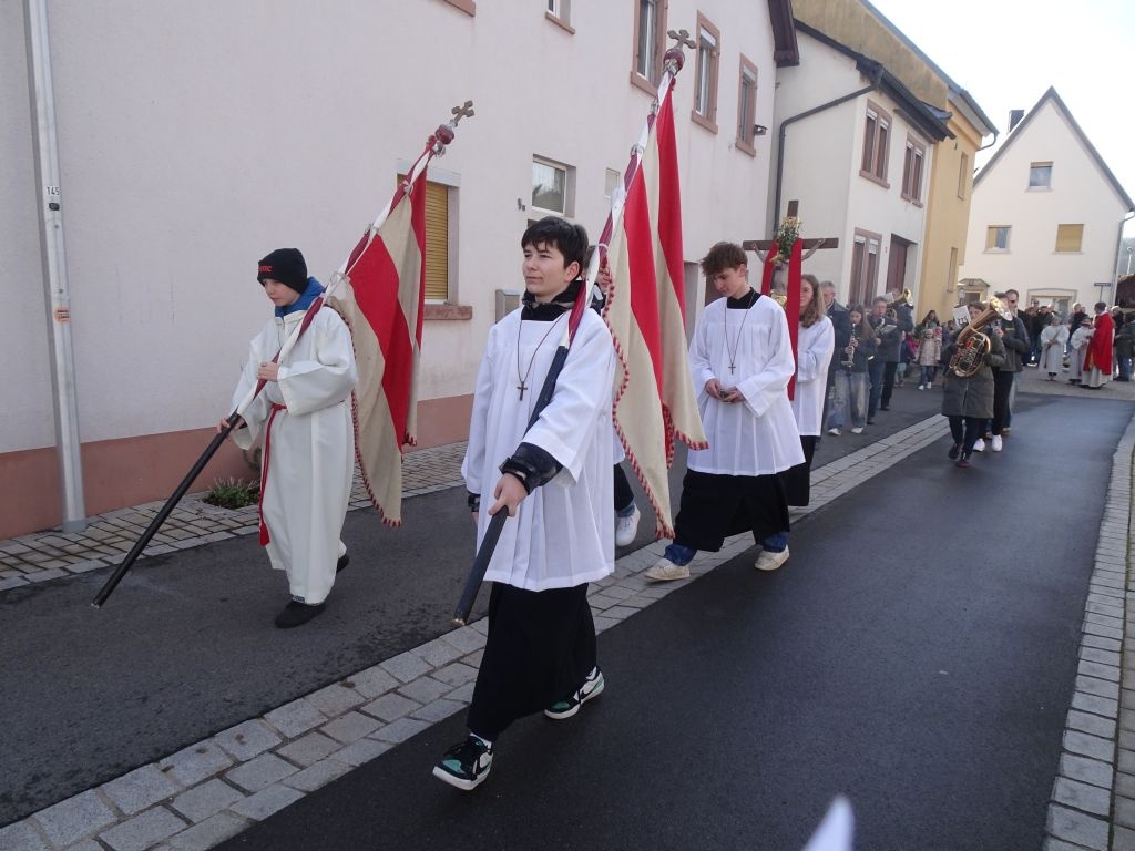 Die Glocken sind verstummt, aber dass es nicht so ruhig bleibt, dafür stehen schon die Klöpperkinder bereit. Angeführt von den Ministranten und tatkräftig unterstützt von Dorfkindern, ziehen sie zu den Gottesdienst- und Gebetszeiten mit Klöppern und Ratschen durch den Ort. In diesen Tagen gibt es viel zu tun für die Gössenheimer Minis, sie organisieren die Klöppergruppen, sammeln Eier und sind immer rechtzeitig bei den Gottesdiensten zum Ministrieren. Großes Lob dafür. Nach alter Tradition ziehen am Freitag- und Samstagmorgen die Ave-Sänger durch den Ort. In den frühen Morgenstunden singen sie einen Gruß an die Muttergottes. Belohnt werden sie am Samstagmorgen mit einem Eierfrühstück, lecker zubereitet vom bewährten Frühstücksteam. Vielen Dank!