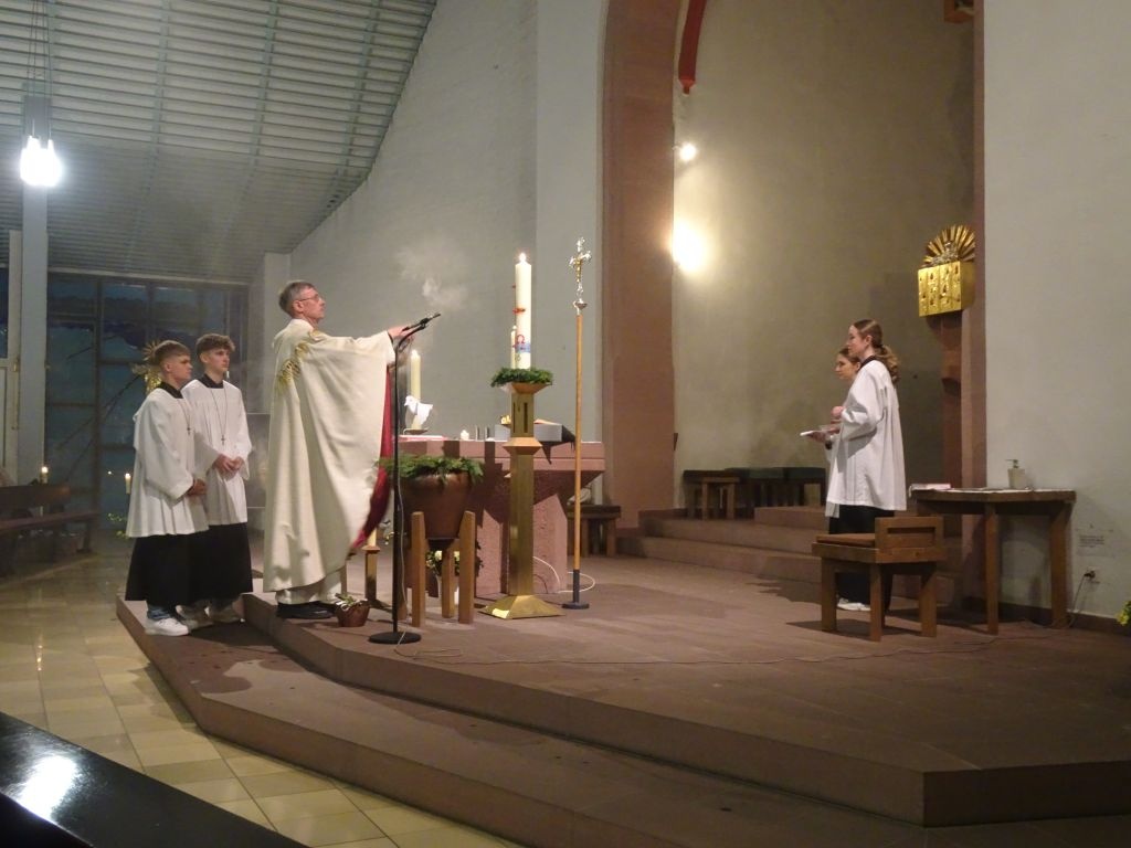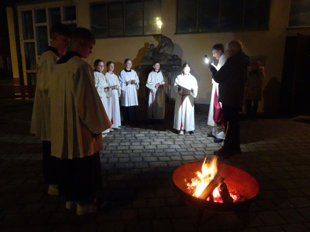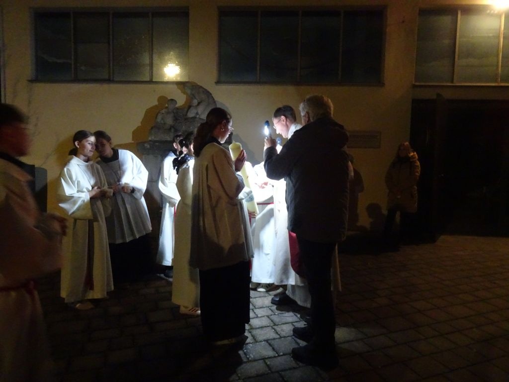 Die Nacht der Nächte, heute schauen wir ins Licht. Wenn wir von dieser Nacht einen kleinen Funken Hoffnung, Menschlichkeit, Verständnis, Anstand, Mitgefühl…. mitnehmen, dann können wir wahrhaft Mensch sein. Die Kirche ist dunkel, nur das Osterfeuer auf dem Kirchplatz leuchtete bei der Lichterfeier. Dort wurde die Osterkerze geweiht, entzündet und in die dunkle Kirche getragen. Das Osterlicht wurde weitergereicht und bis zum Gloria wurde der Kirchenraum vom Kerzenschein erleuchtet. Dann läuteten die Glocken, die Orgel erklang und es wurde hell. Mit dem neu geweihten Taufwasser wurden die Gläubigen und die mitgebrachten Osterspeisen gesegnet. Anschließend hatte das Gemeindeteam zu einem kleinen Osterumtrunk in das Pfarrheim eingeladen.