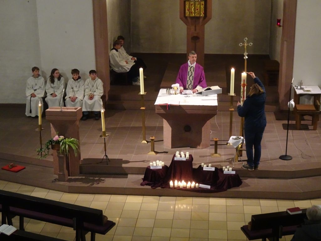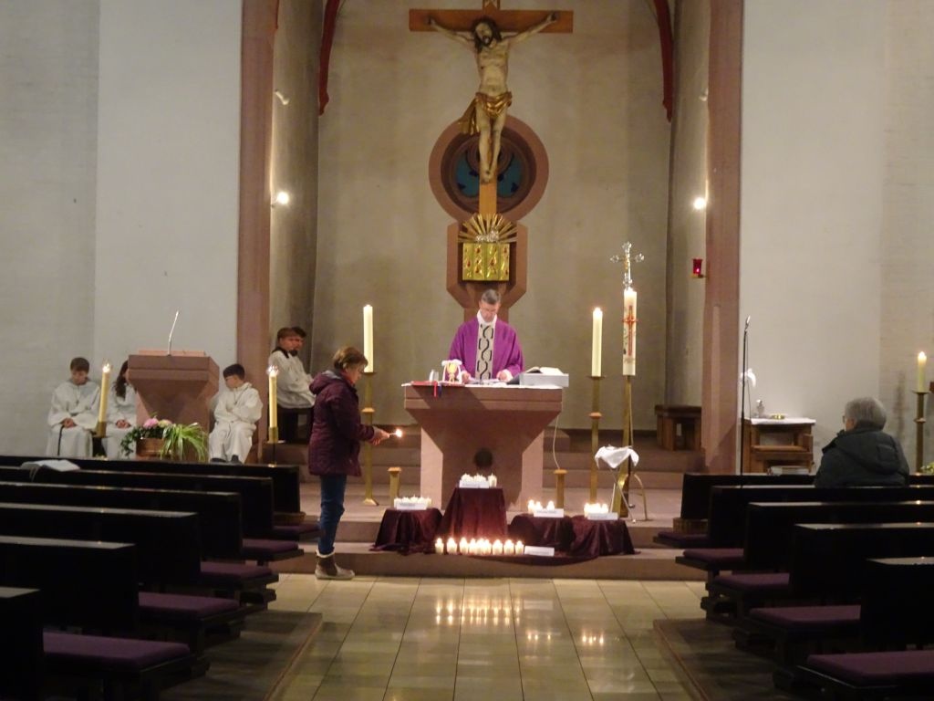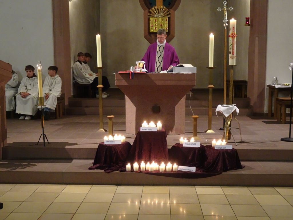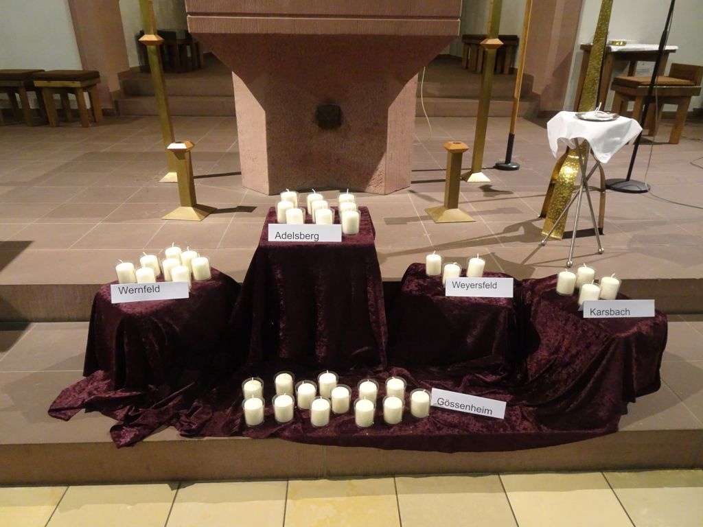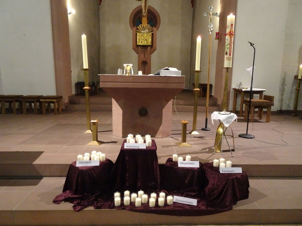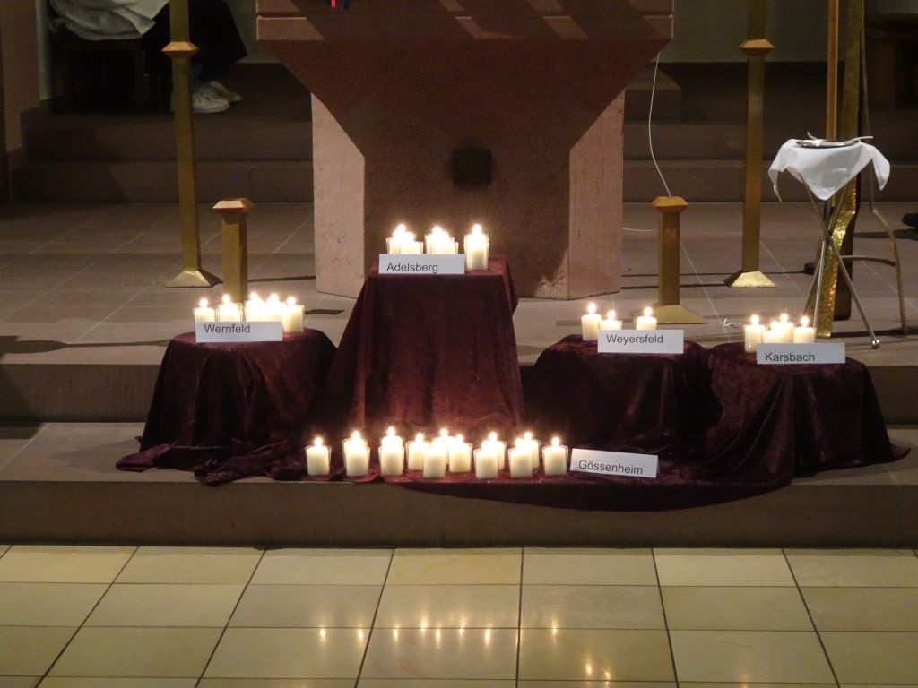 Für alle Angehörigen, der im letzten Jahr Verstorbenen, wurde dieser außergewöhnliche Gottesdienst in der Kirche Gössenheim vorbereitet. In einer würdevollen Gedenkfeier erinnerte Pfr. Thoma an die vorausgegangenen Familienmitglieder und las die Namen der Verstorbenen aller Ortschaften vor, dabei wurde für jeden Heimgegangenen eine Kerze entzündet. Diese leuchtende Erinnerung konnten die anwesenden Angehörigen mit nach Hause nehmen.