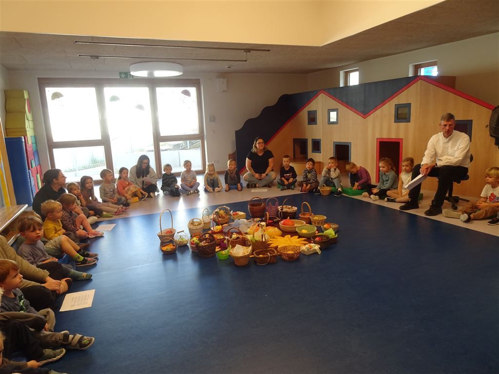 Geerntet und gesammelt haben die „Kleinen“ natürlich auch und viele verschiedene Erntegaben mitgebracht und es entstand ein vielfältiges, buntes Erntedankbild. Nach der Segnung durften die Kinder ihre vollen Körbchen wieder mit nach Hause nehmen und es sich schmecken lassen.