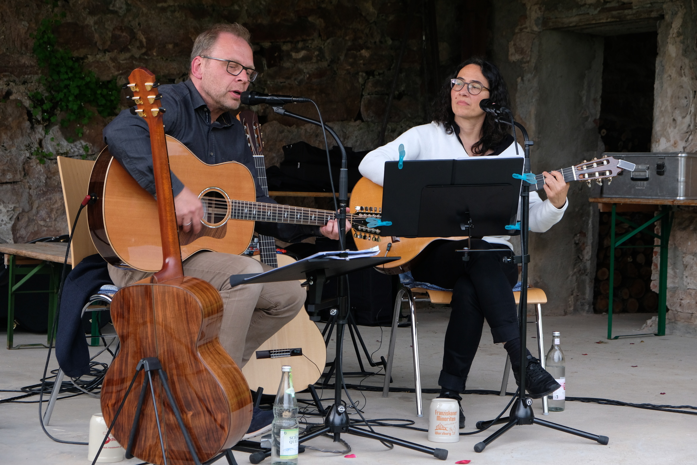 Bettina Schaaf und Stefan Jehn brachten mit virtuosem Gitarrenspiel und Gesang ein breites Repertoire auf die Bühne. Im Lied „True Colors“ von Cindy Lauper heißt es: „Ich sehe deine wahren Farben. Hab keine Angst sie zu zeigen. Sie sind wunderschön wie ein Regenbogen“. Gerhard Schönes Lied „Vielleicht wird’s nie wieder so schön“ berührte mit dem Beschreiben kindlicher Geborgenheit unter Vaters Mantel in der Kälte, dem heimlichen nächtlichen Schwimmen bei einem Jugendlager oder der ersten verliebten Umarmung.