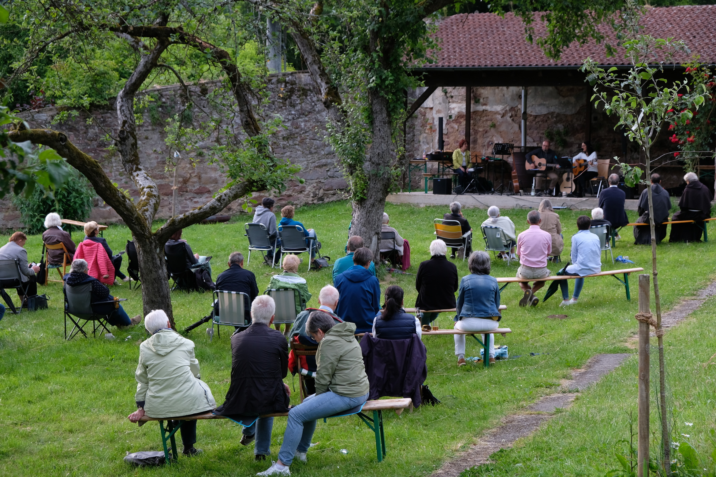 Der Garten des Schönauer Franziskanerklosters und die rauschende Saale bildeten die romantische Kulisse an diesem Sommerabend. Hundert Gäste erfreuten sich an den Beiträgen des Gitarrenduos. Burkhard und Edith Fecher streuten Gebete, Texte aus Bibel und Poesie dazwischen und führten in den Inhalt der Lieder ein. Einzelne und Paare nutzten in der Pause das Angebot zu einem persönlichen „Segen unter Bäumen“.