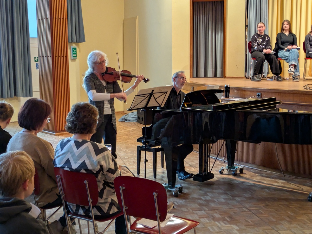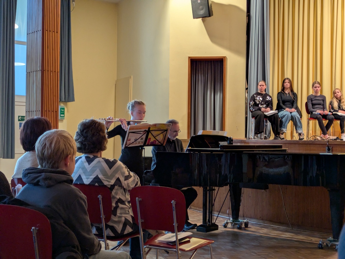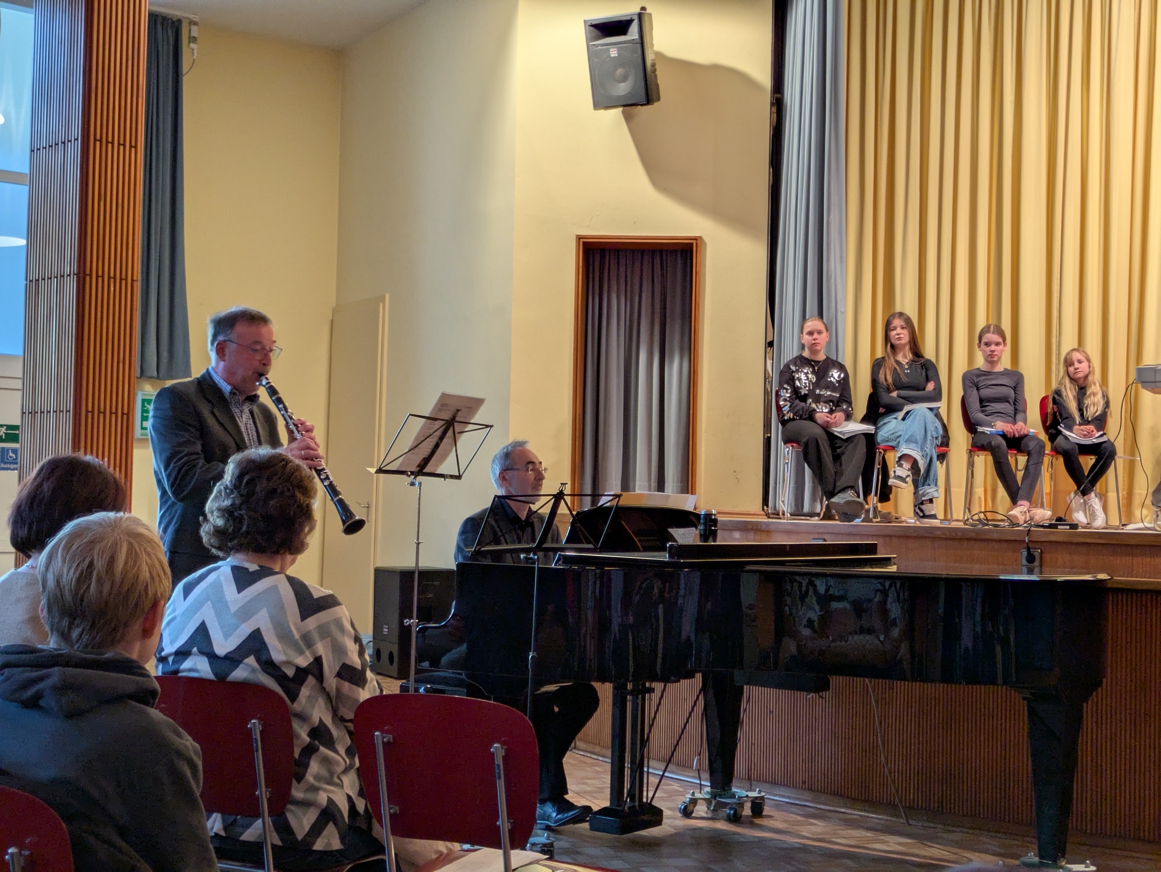 Solist*innen für die Instrumentalstücke waren die Schülerin Lotta Vogt an der Querflöte, Dr. Claudia Breitfeld – selbst über 30 Jahre Musiklehrerin an der Schule und langjährige Mitgestalterin der Abendgesänge an Orgel und Violine, aber auch textlich mit Sprechmotetten und anderen kreativen Elementen - an der Violine und Rainer Oberste-Dommes an der Klarinette.