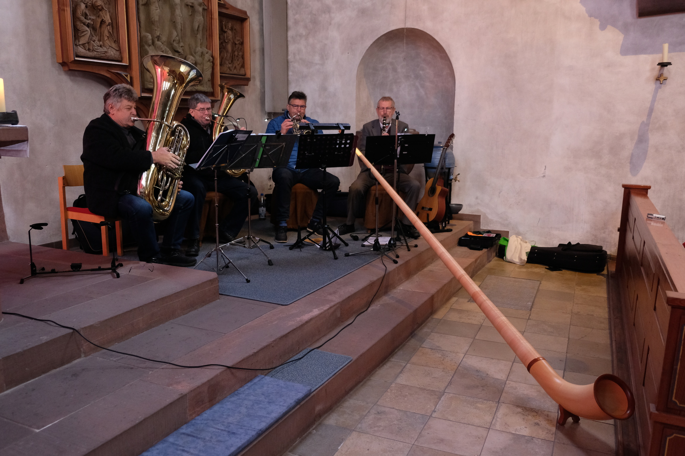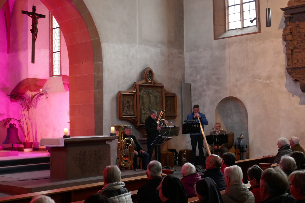 Witze in fränkischer Mundart waren dabei die Kirsche auf der Sahnetorte, die in fröhlichen, aber auch nachdenklichen Liedern und Texten dargeboten wurde. Dabei wurde es den 120 Gäste in der kühlen Kirche warm ums Herz. Die Mitglieder der Gruppe „Querbeet“ brachten neben ihrem Gesang eine Vielzahl von Instrumenten zum Einsatz: Tenorhorn (Werner Sauer), Tuba (Willi Dotter), Trompete und Alphorn (Josef Menning), Klarinette und Gitarre (Alfons Schlereth).