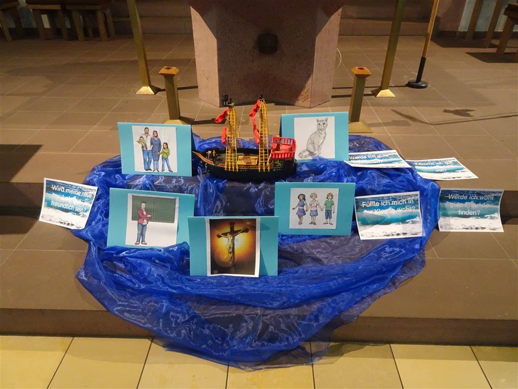 Die Schüler machen sich so ihre Gedanken, wo die Reise in der neuen Klasse hingeht: Finde ich gute Freunde, ist meine Lehrerin nett, lerne ich den Unterrichtsstoff schnell ….. Mit all diesen Sorgen müssen die Kinder aber nicht alleine klarkommen, sie dürfen ihre Ängste Gott anvertrauen. Noch etwas ist beruhigend, in ihrem Lebensboot sitzen sie nicht allein. Die Freunde, die Eltern und Großeltern, die Lehrerin und vielleicht auch ein Haustier, sind mit ihnen unterwegs. Wenn die Fahrt einmal stürmisch wird und das Boot schaukelt, dann ist es schön, wenn jemand mit viel Mut uns begleitet, so wie Jesus. Er ist immer bei uns und lässt uns nicht allein.
