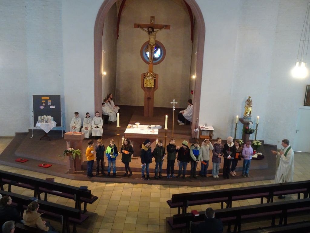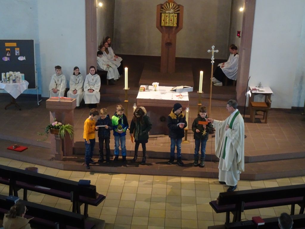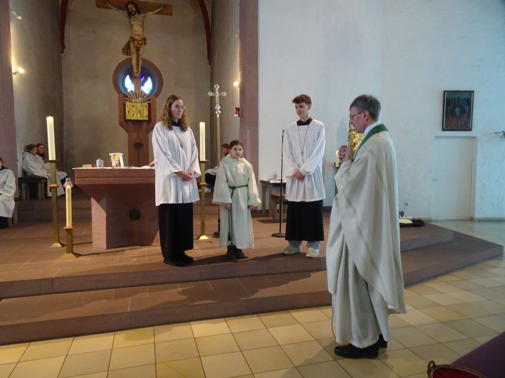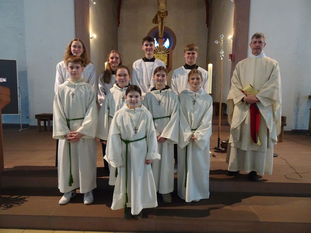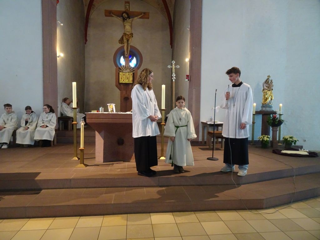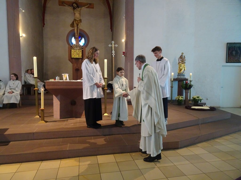 Noch eine gute Gemeinschaft haben wir in Gössenheim, unsere Ministranten. Diese nutzten die gute Gelegenheit und nahmen eine neue Ministrantin in ihrer Mitte auf. Feierlich wurde sie von den Oberministranten und Pfr. Thoma mit Handschlag begrüßt und ihr wurde das Kreuzchen überreicht. Stolz können die Minis behaupten, 100 Prozent der letztjährigen Kommunionkinder aus Gössenheim ist in unserer Truppe gelandet. Liebe Lisa, herzlich willkommen im Team.