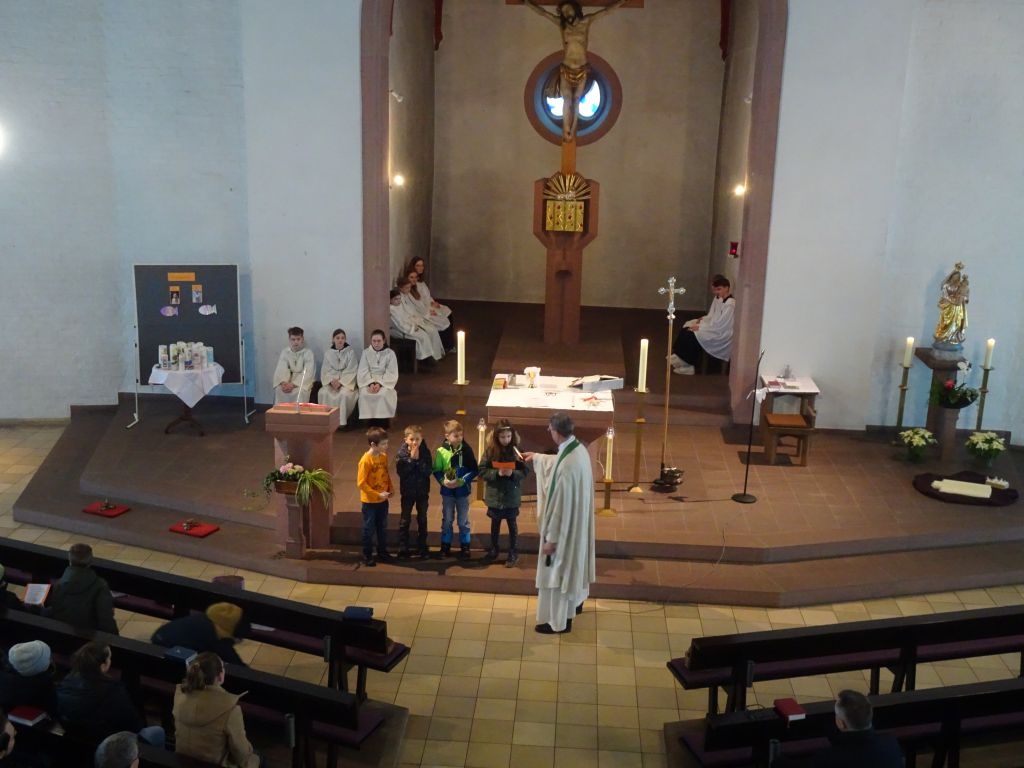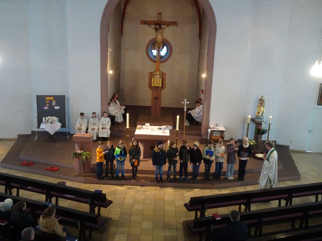 Die Erstkommunion rückt immer näher und die Kommunionkinder aus Adelsberg, Wernfeld, Gössenheim, Sachsenheim, Karsbach und Weyersfeld möchten sich in jeder Gemeinde einmal persönlich vorstellen. Heute war es in der St. Radegundiskirche so weit. Nacheinander versammelten sie sich vor dem Altar und gestalteten die Messe mit vorgetragenen Fürbitten, welche sie aus unserem Glaubensbekenntnis abgeleitet haben, mit