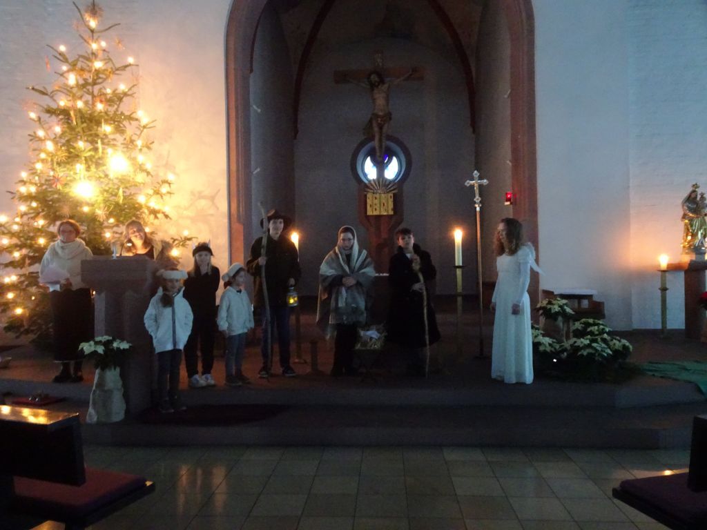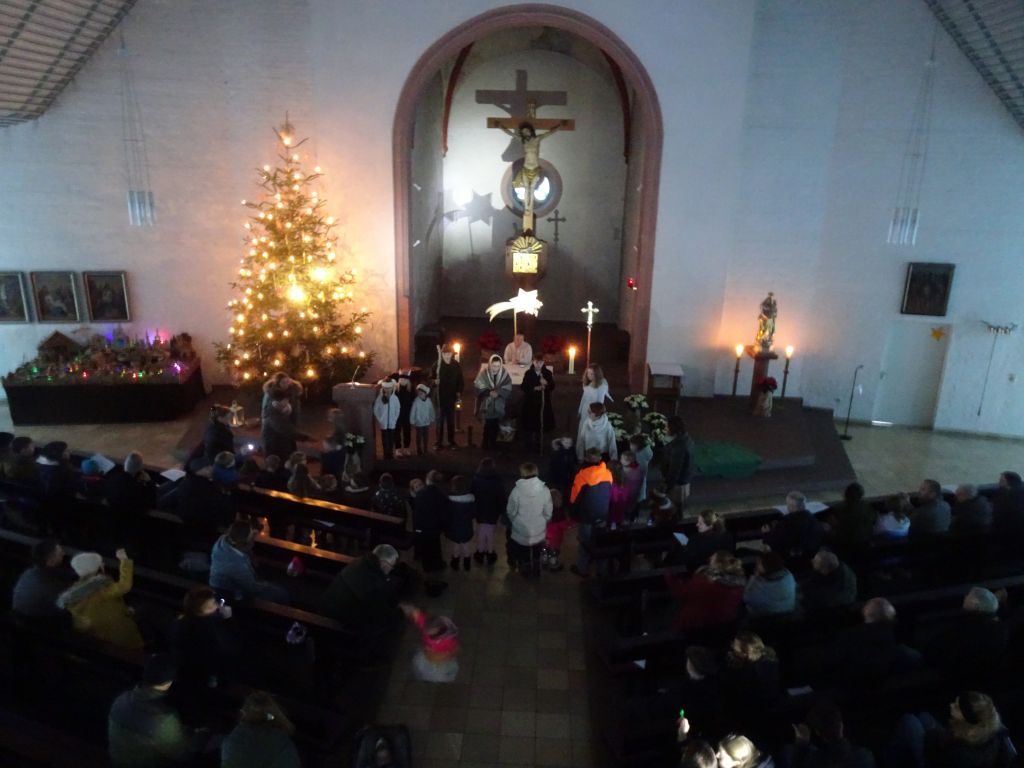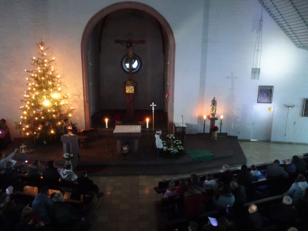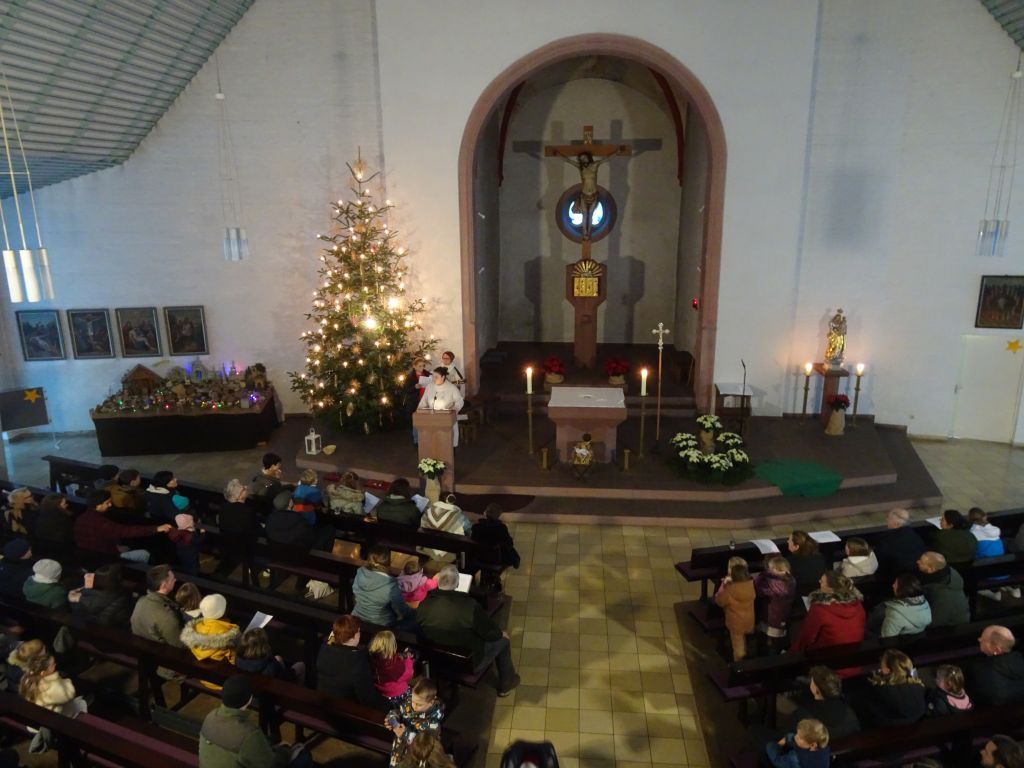 Heilig Abend gehörte der Kirchenraum den Kindern. Zu einer besonderen Krippenfeier hat Lara Richter und das Familienteam eingeladen und viele Familien sind dieser Einladung gefolgt. Die Kinder erhielten zu Beginn der Feier ein kleines Geschenk, eine Taschenlampe, die eine wichtige Aufgabe in der folgenden Geschichte hat: Ein kleines Schaf wurde von der Herde getrennt, auf seiner Suche begegnete dem Schäfchen ein Engel, der es nach Betlehem sandte. Es war dunkel, aber es leuchtete ein besonderer Stern, der Stern von Bethlehem. Gemeinsam mit dem kleinen Schäfchen folgten wir diesem Licht, der uns den Weg zur Krippe zeigte. Damit dieser Stern auch immer hell strahlte, wurde er von zahlreichen Taschenlampen angeleuchtet, natürlich übernahmen das die Kinder gerne.