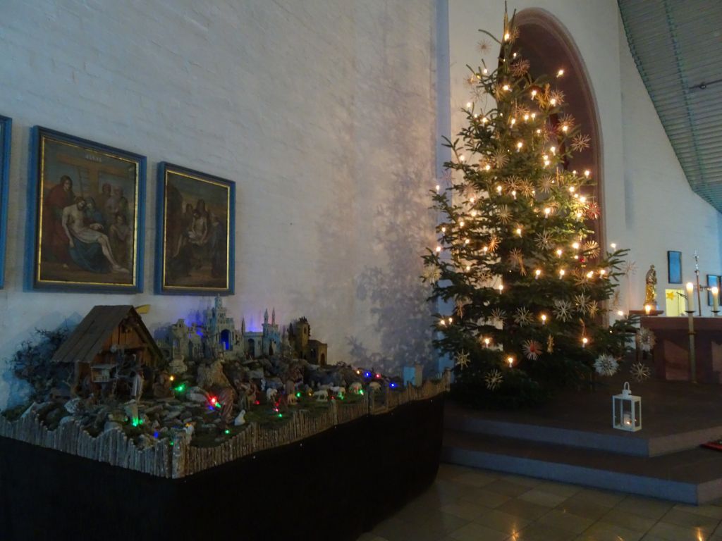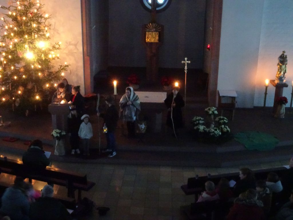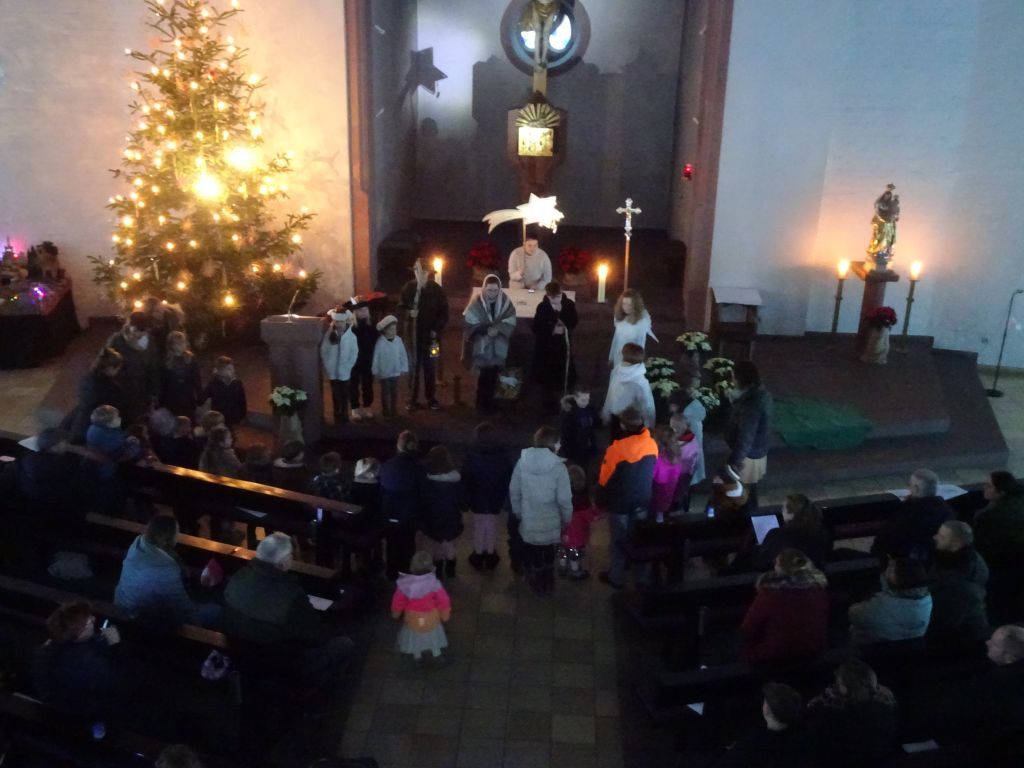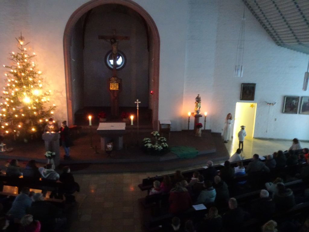 Heilig Abend gehörte der Kirchenraum den Kindern. Zu einer besonderen Krippenfeier hat Lara Richter und das Familienteam eingeladen und viele Familien sind dieser Einladung gefolgt. Die Kinder erhielten zu Beginn der Feier ein kleines Geschenk, eine Taschenlampe, die eine wichtige Aufgabe in der folgenden Geschichte hat: Ein kleines Schaf wurde von der Herde getrennt, auf seiner Suche begegnete dem Schäfchen ein Engel, der es nach Betlehem sandte. Es war dunkel, aber es leuchtete ein besonderer Stern, der Stern von Bethlehem. Gemeinsam mit dem kleinen Schäfchen folgten wir diesem Licht, der uns den Weg zur Krippe zeigte. Damit dieser Stern auch immer hell strahlte, wurde er von zahlreichen Taschenlampen angeleuchtet, natürlich übernahmen das die Kinder gerne.